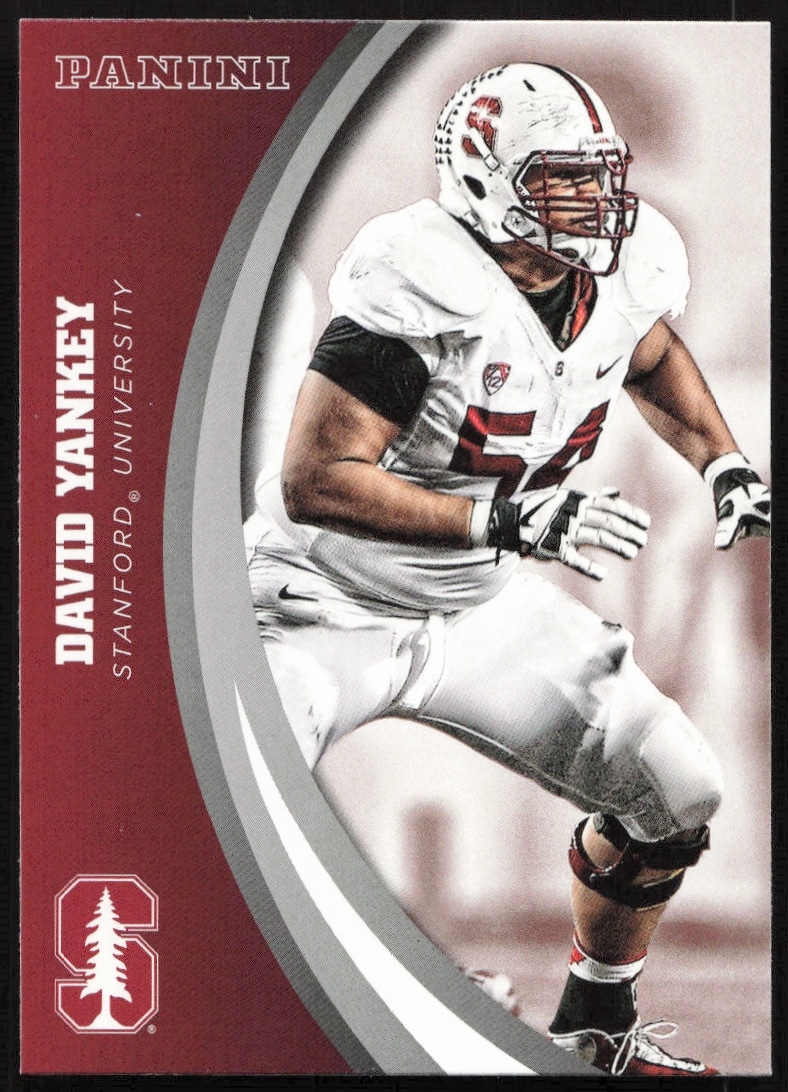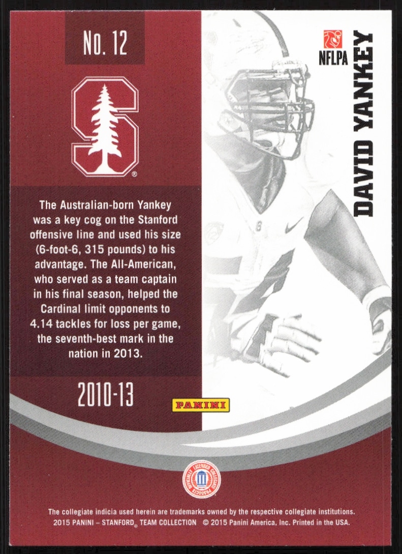 This Football card, from 2015 is part of the Panini Stanford University card set. David Yankey is featured and has a card number of 12.