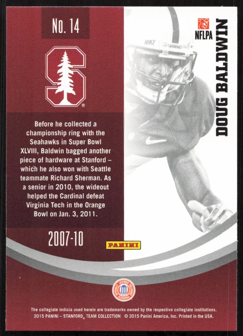This Football card, from 2015 is part of the Panini Stanford University card set. Doug Baldwin is featured and has a card number of 14.
