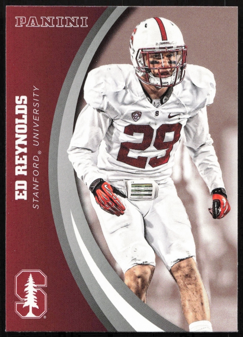 This Football card, from 2015 is part of the Panini Stanford University card set. Ed Reynolds is featured and has a card number of 15.