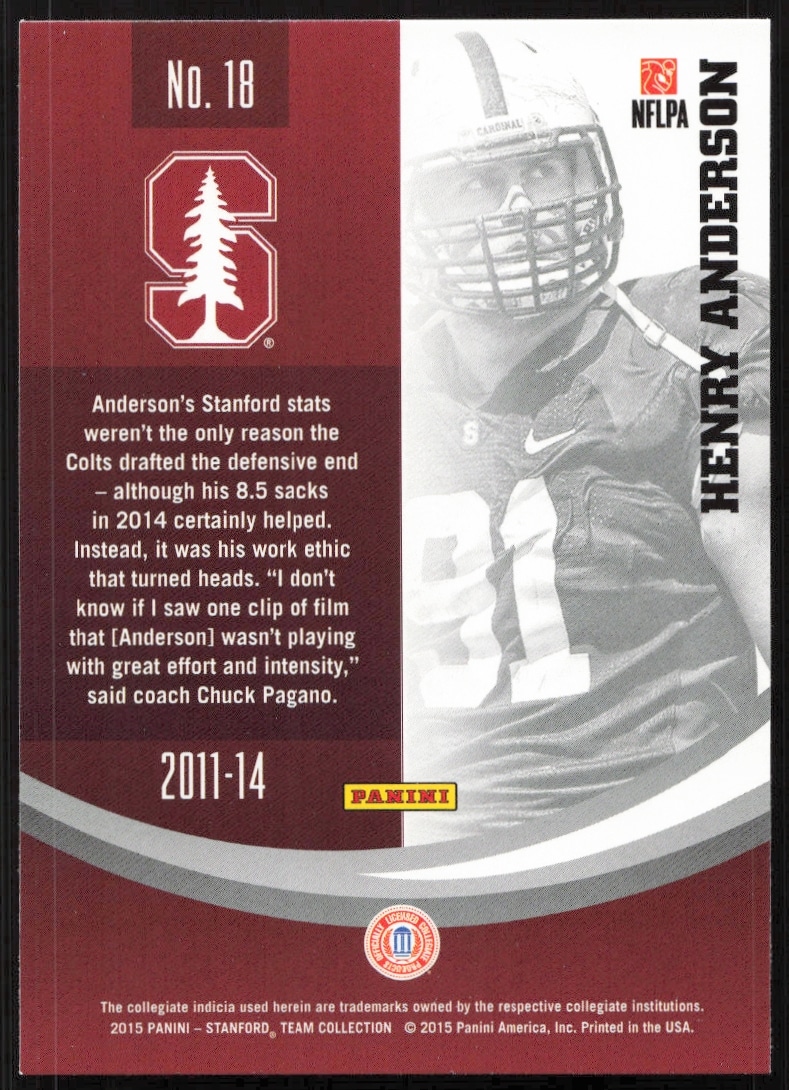 This Football card, from 2015 is part of the Panini Stanford University card set. Henry Anderson is featured and has a card number of 18.