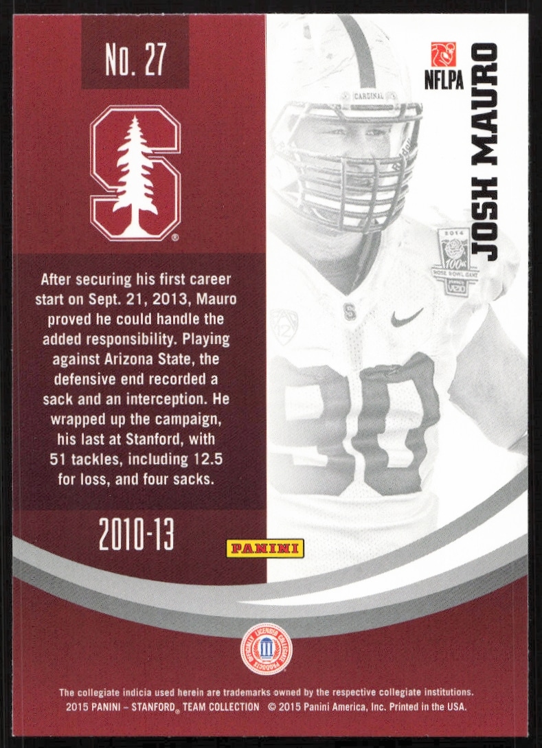 This Football card, from 2015 is part of the Panini Stanford University card set. Josh Mauro is featured and has a card number of 27.