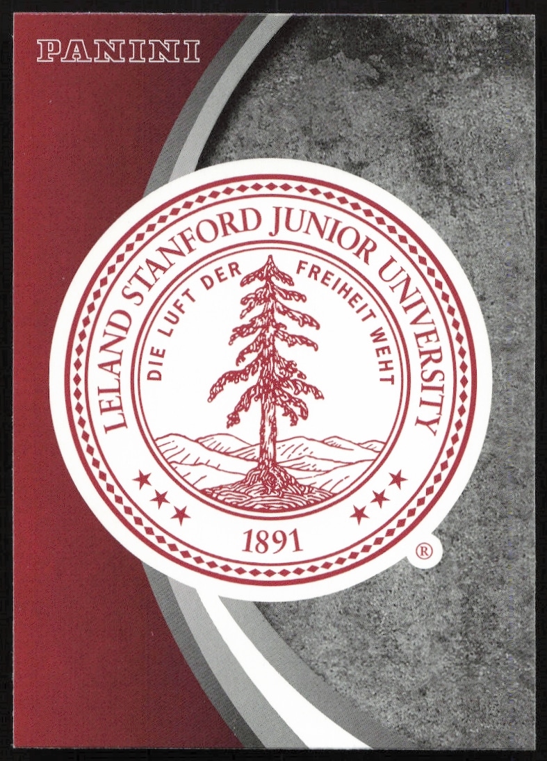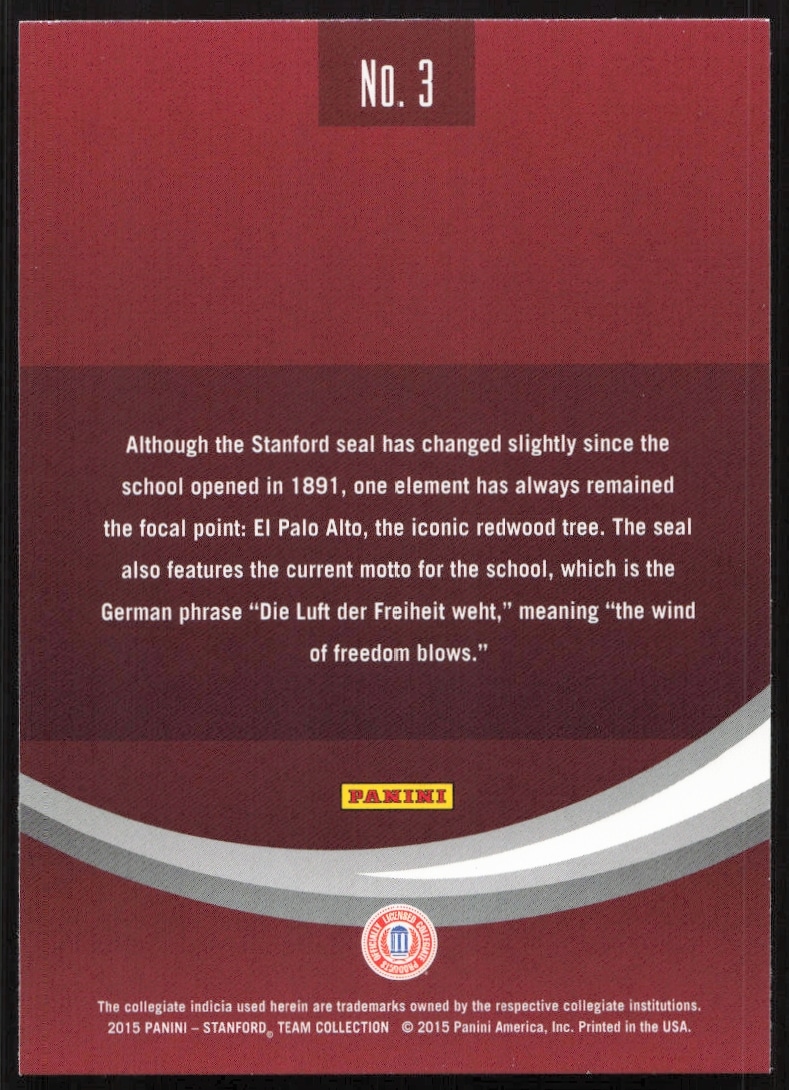 This card, from 2015 is part of the Panini Stanford University card set. Stanford Seal is featured and has a card number of 3.