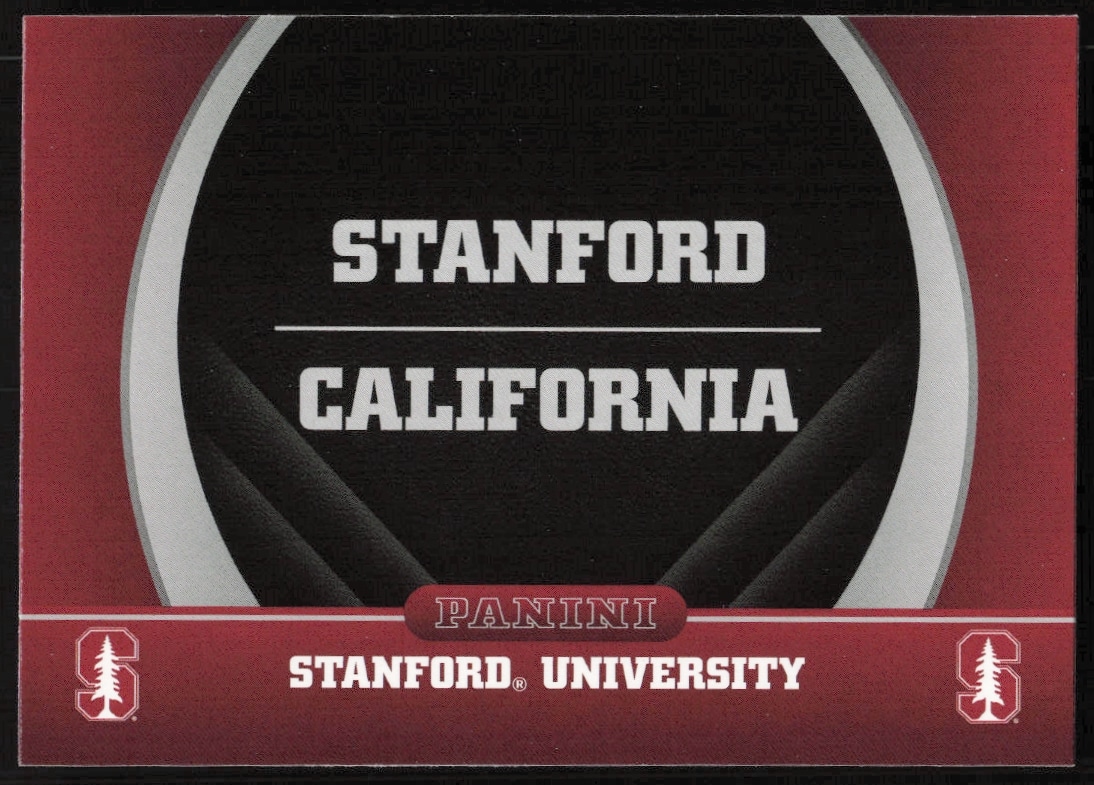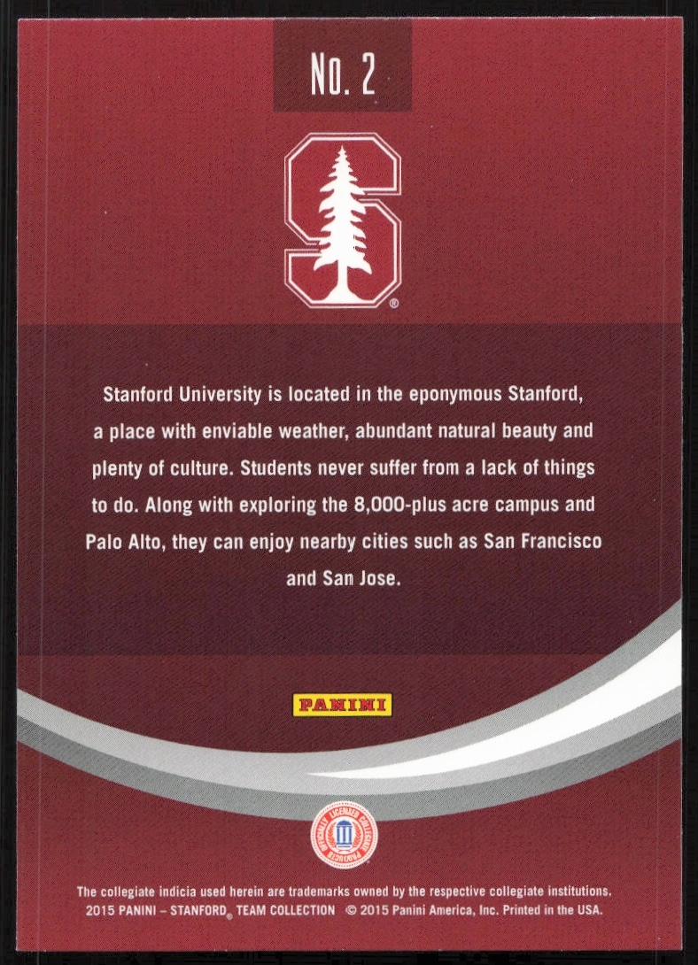 This card, from 2015 is part of the Panini Stanford University card set. Stanford University is featured and has a card number of 2.