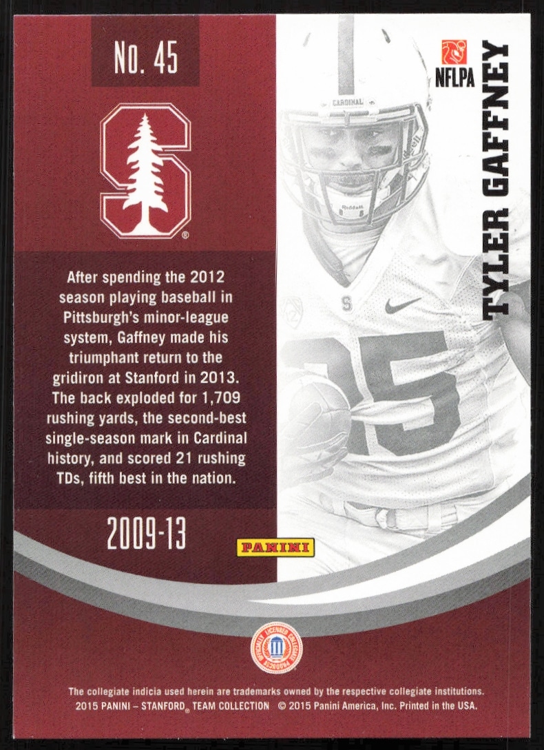 This Football card, from 2015 is part of the Panini Stanford University card set. Tyler Gaffney is featured and has a card number of 45.