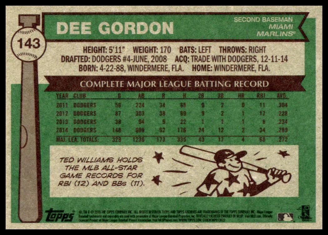 This BaseballΒ card, from 2015 is part of the Topps ArchivesΒ card set. Dee Gordon is featured and has a card number of 143.