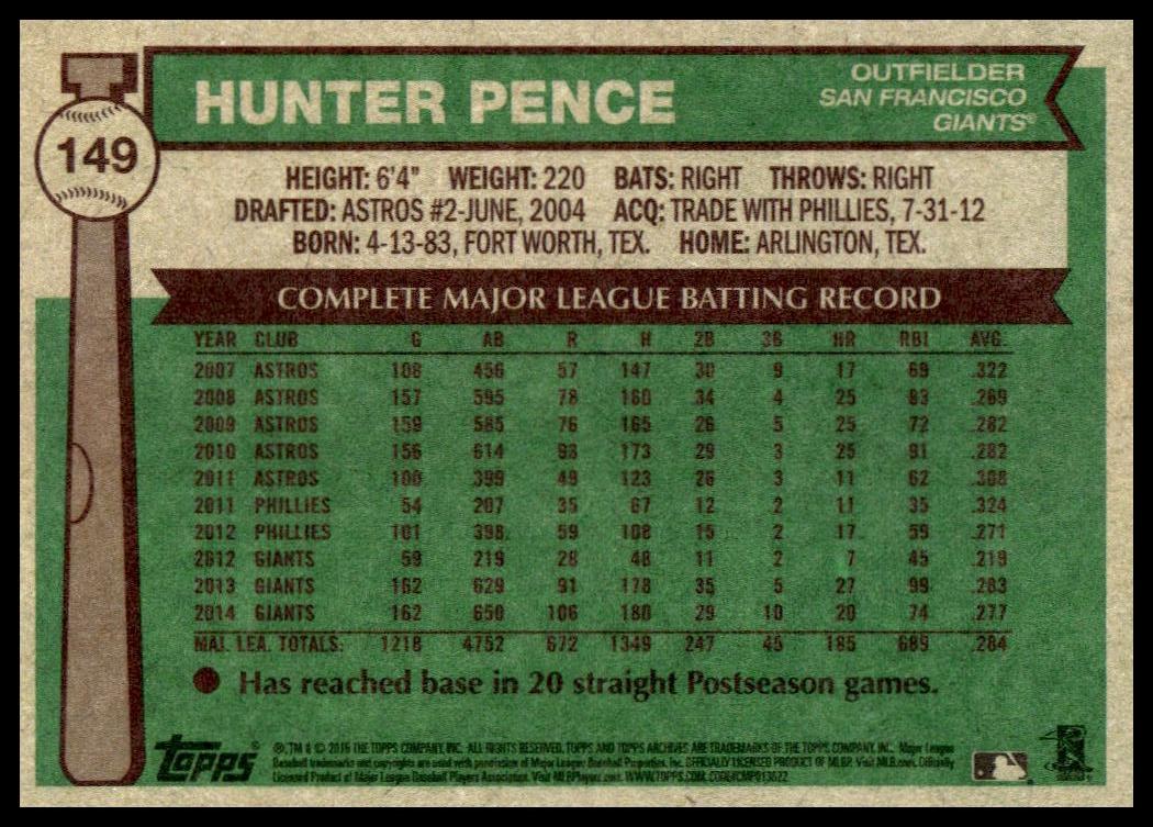 This Baseball card, from 2015 is part of the Topps Archives card set. Hunter Pence is featured and has a card number of 149.