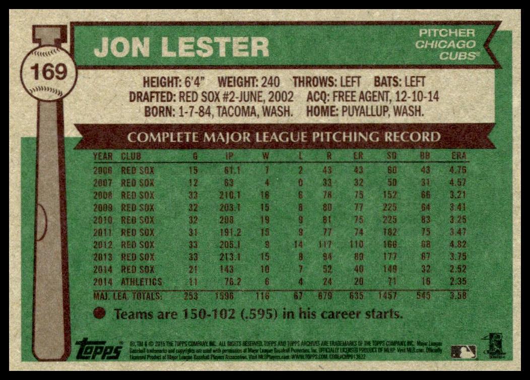 This Baseball card, from 2015 is part of the Topps Archives card set. Jon Lester is featured and has a card number of 169.