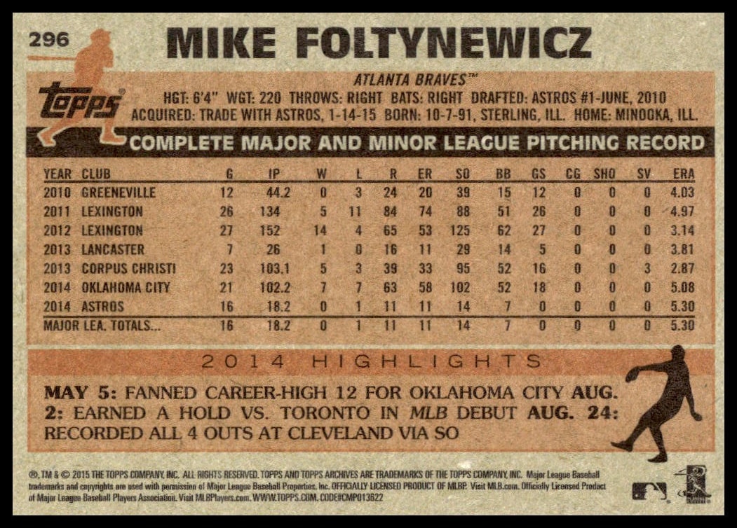 This BaseballΒ card, from 2015 is part of the Topps ArchivesΒ card set. Mike Foltynewicz is featured and has a card number of 296.
