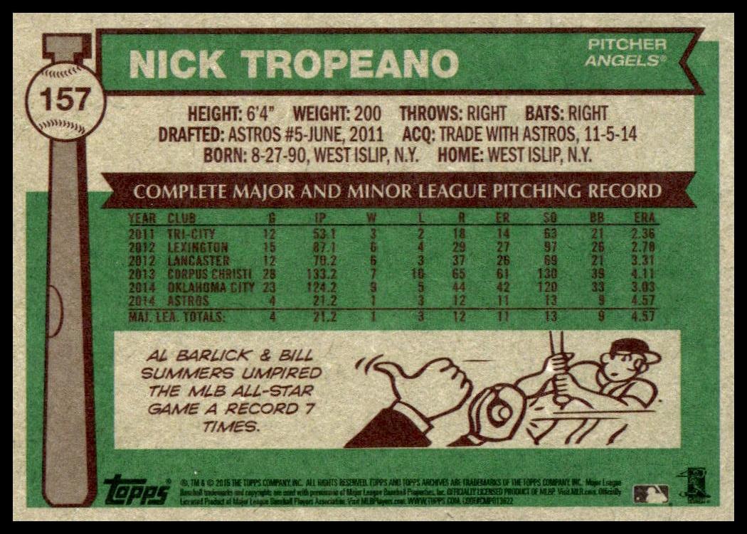 This BaseballΒ card, from 2015 is part of the Topps ArchivesΒ card set. Nick Tropeano is featured and has a card number of 157.