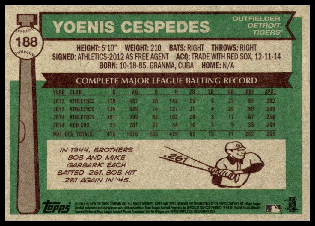 This BaseballΒ card, from 2015 is part of the Topps ArchivesΒ card set. Yoenis Cespedes is featured and has a card number of 188.