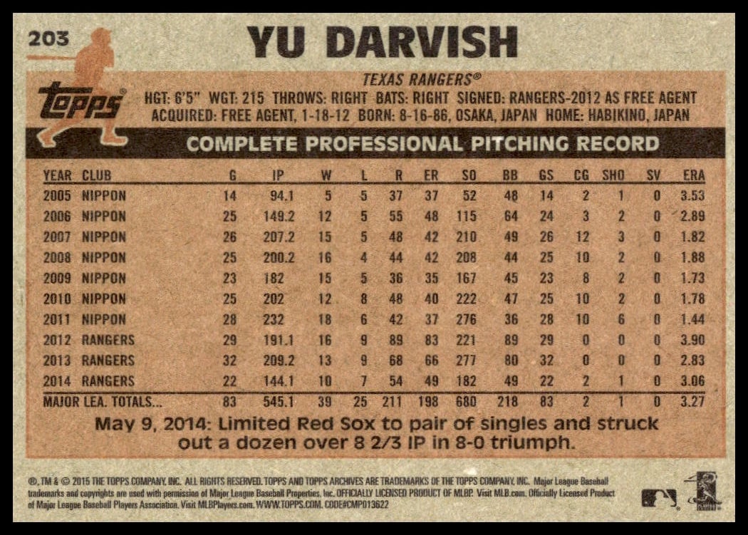 This BaseballΒ card, from 2015 is part of the Topps ArchivesΒ card set. Yu Darvish is featured and has a card number of 203.
