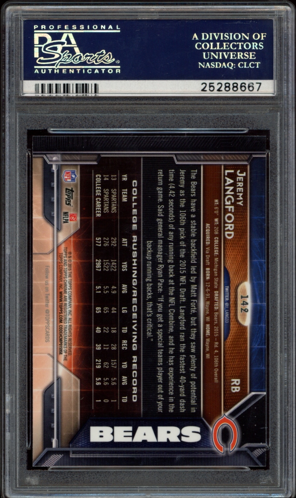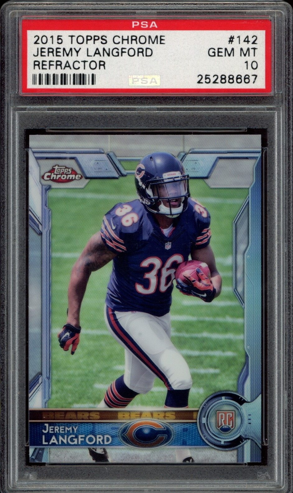 This Football card, from 2015 is part of the Topps Chrome card set. Jeremy Langford is featured and has a card number of 142. It is graded by PSA and has a numeric grade of 10.