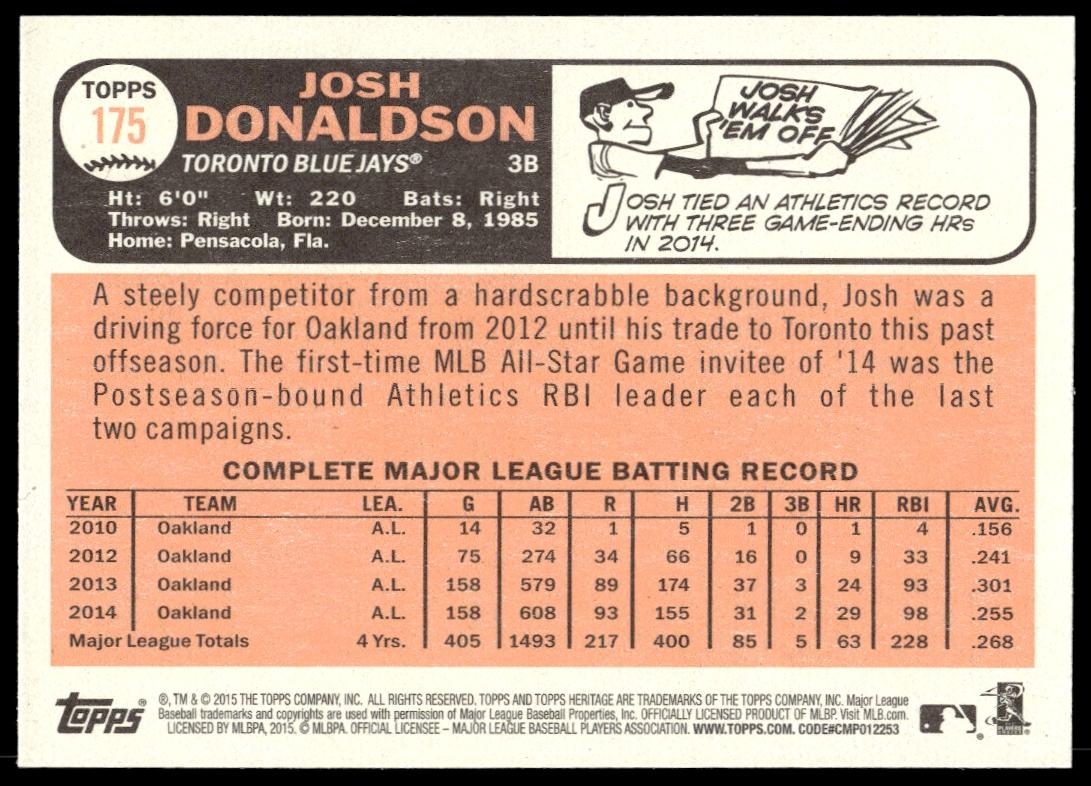 This BaseballΒ card, from 2015 is part of the Topps ChromeΒ card set. Josh Donaldson is featured and has a card number of 175.