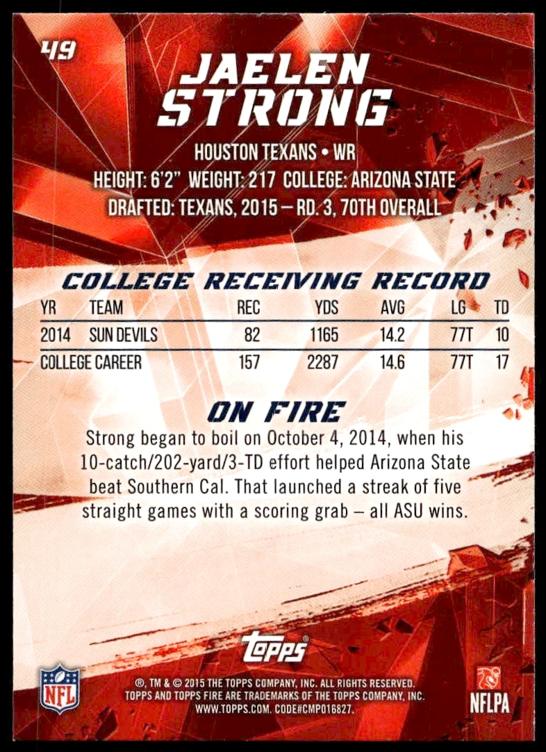 This Football card, from 2015 is part of the Topps Fire card set. Jaelen Strong is featured and has a card number of 49.