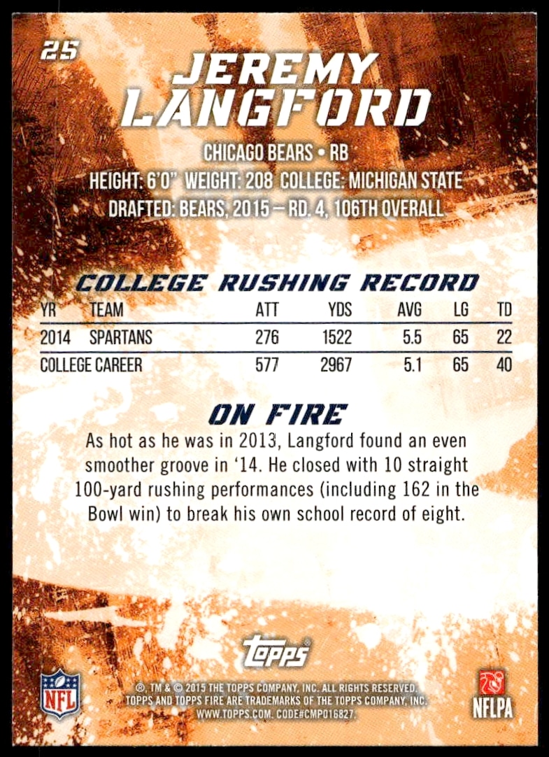 This Football card, from 2015 is part of the Topps Fire card set. Jeremy Langford is featured and has a card number of 25.
