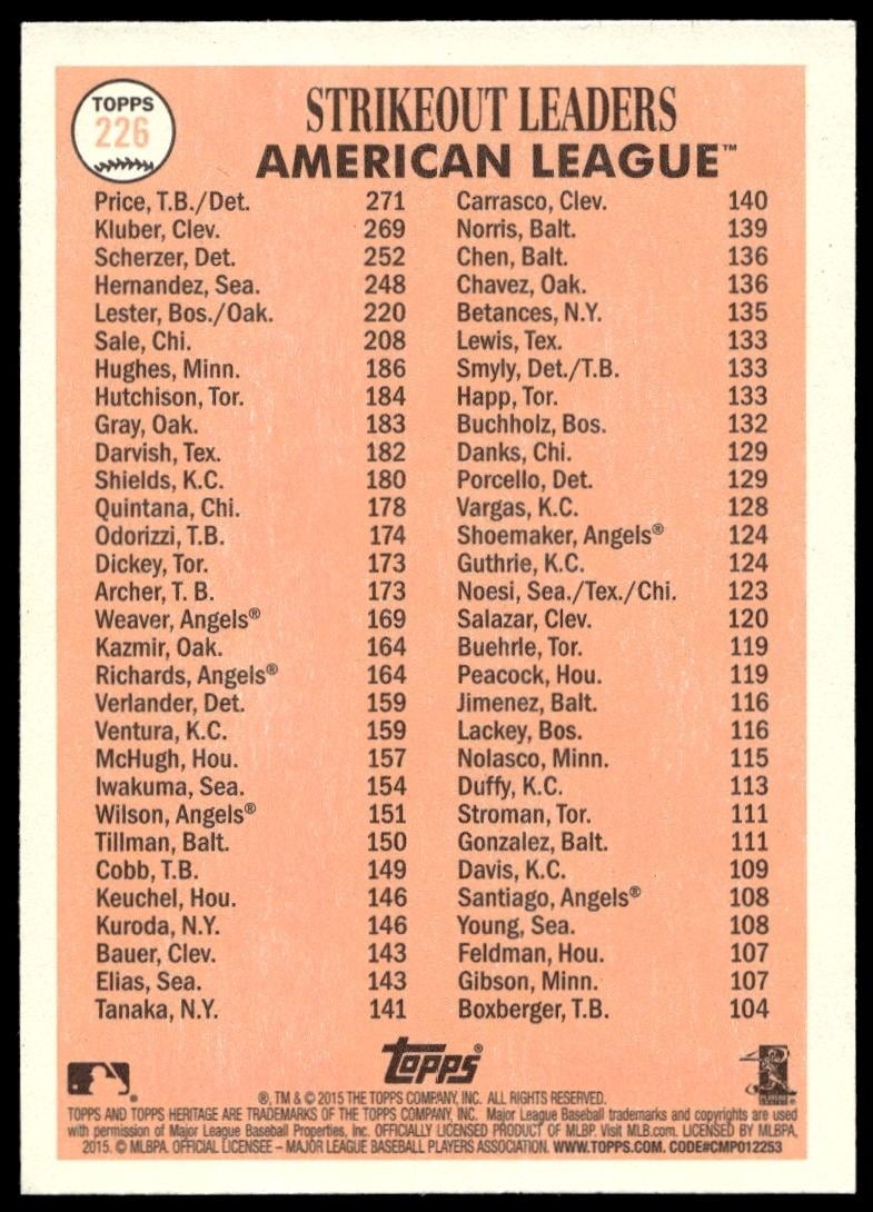 This Baseball card, from 2015 is part of the Topps Heritage card set. 2014 Strikeout Leaders Checklist is featured and has a card number of 226.