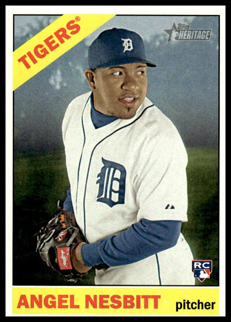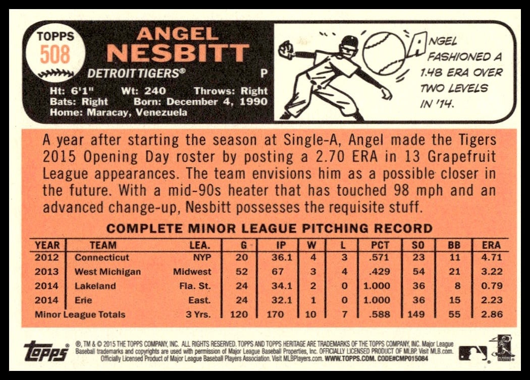 This Baseball card, from 2015 is part of the Topps Heritage card set. Angel Nesbitt is featured and has a card number of 508.