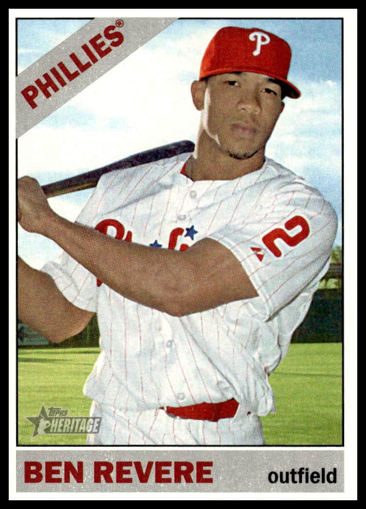 This Baseball card, from 2015 is part of the Topps Heritage card set. Ben Revere is featured and has a card number of 230.