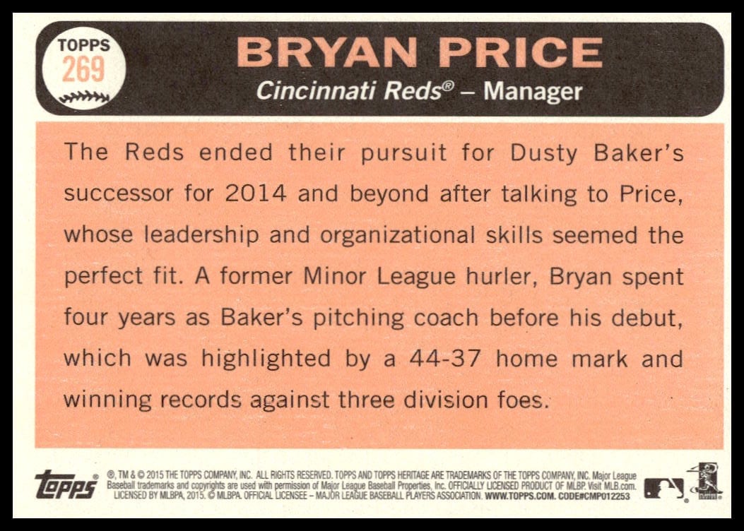 This Baseball card, from 2015 is part of the Topps Heritage card set. Bryan Price is featured and has a card number of 269.