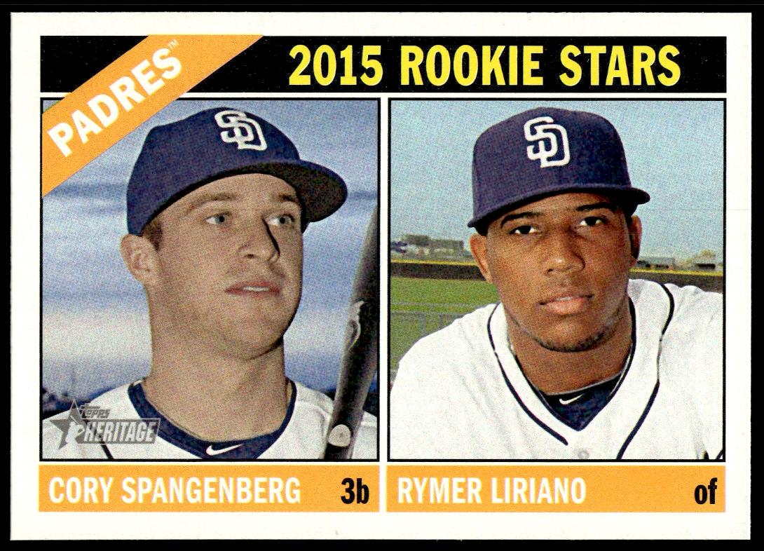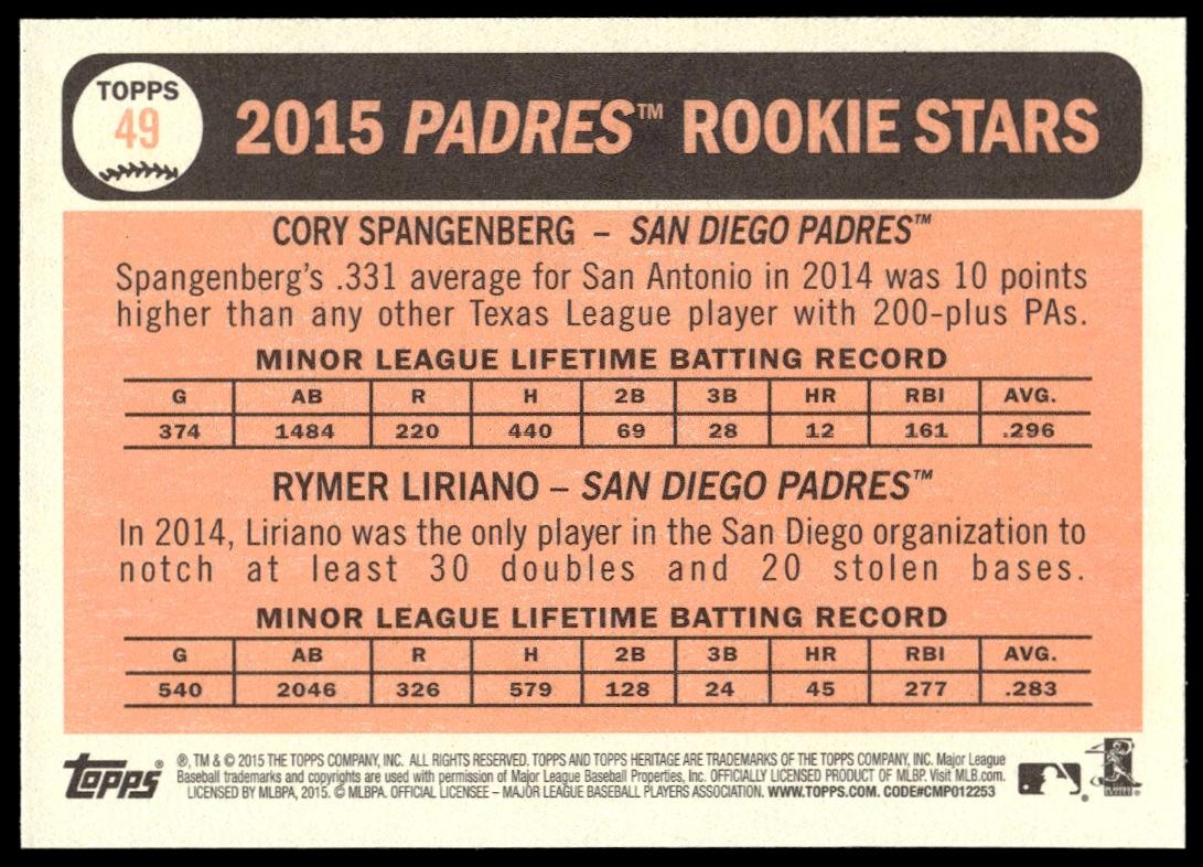 This Baseball card, from 2015 is part of the Topps Heritage card set. Cory Spangenberg / Rymer Liriano is featured and has a card number of 49.