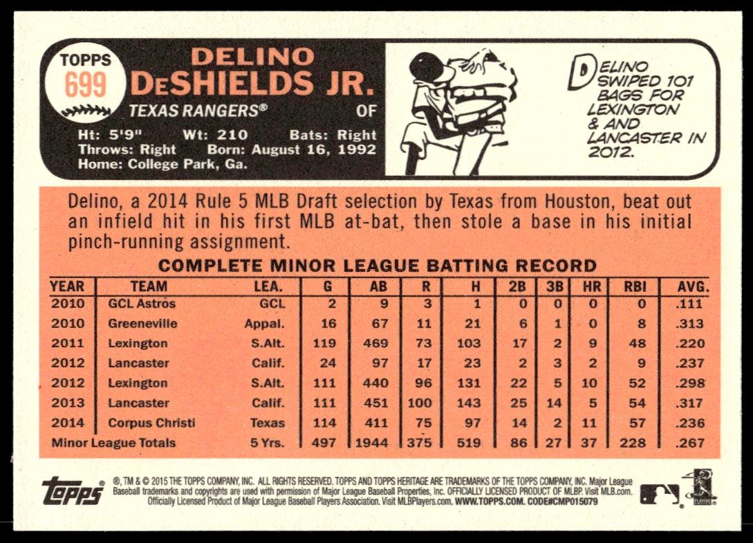 This BaseballΒ card, from 2015 is part of the Topps HeritageΒ card set. Delino DeShields Jr. is featured and has a card number of 699.