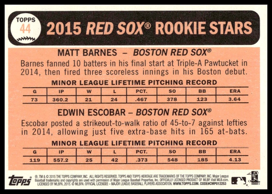 This BaseballΒ card, from 2015 is part of the Topps HeritageΒ card set. 2015 Rookie Stars (Edwin Escobar / Matt Barnes) is featured and has a card number of 44.