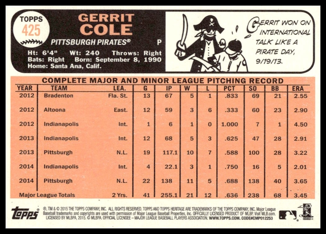 This Baseball card, from 2015 is part of the Topps Heritage card set. Gerrit Cole is featured and has a card number of 425.