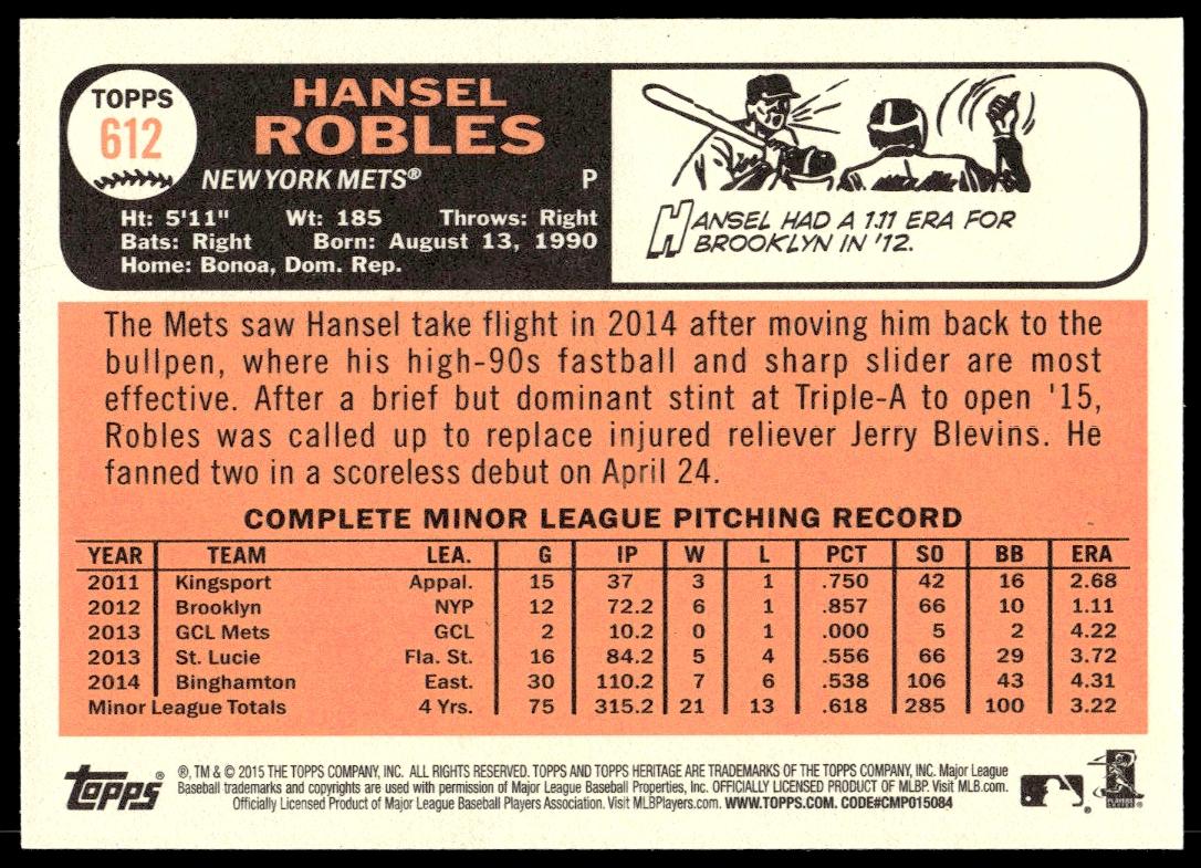 This Baseball card, from 2015 is part of the Topps Heritage card set. Hansel Robles is featured and has a card number of 612.