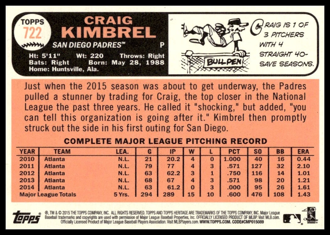 This BaseballΒ card, from 2015 is part of the Topps Heritage High NumberΒ card set. Craig Kimbrel is featured and has a card number of 722.