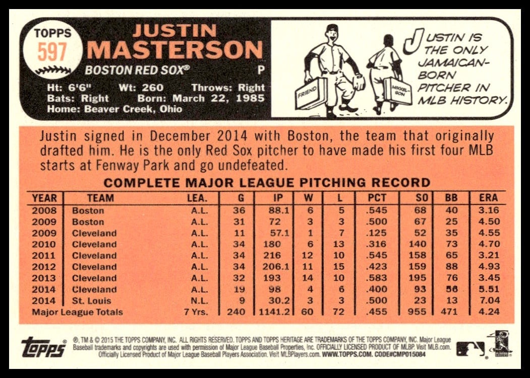 This BaseballΒ card, from 2015 is part of the Topps Heritage High NumberΒ card set. Justin Masterson is featured and has a card number of 597.