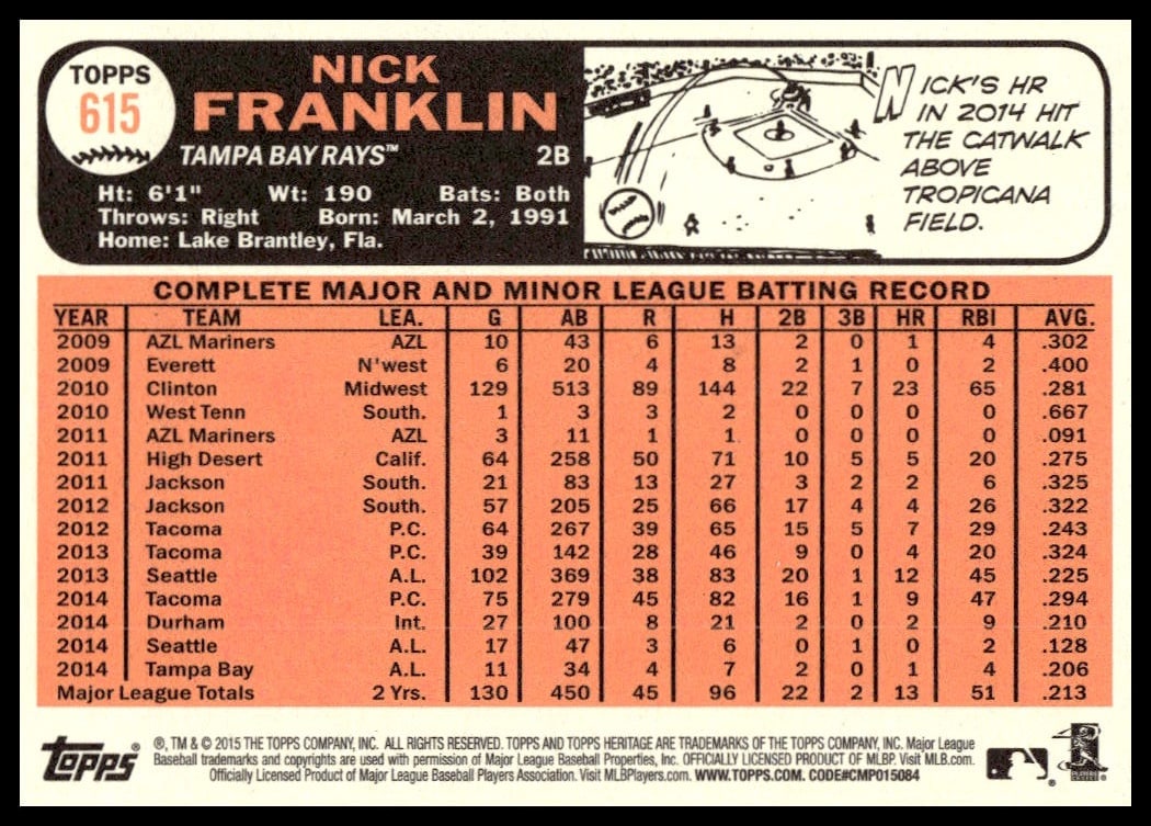 This BaseballΒ card, from 2015 is part of the Topps Heritage High NumberΒ card set. Nick Franklin is featured and has a card number of 615.