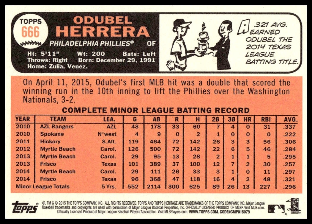 This BaseballΒ card, from 2015 is part of the Topps Heritage High NumberΒ card set. Odubel Herrera is featured and has a card number of 666.