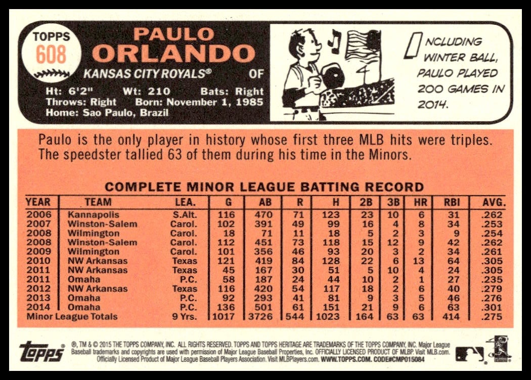 This BaseballΒ card, from 2015 is part of the Topps Heritage High NumberΒ card set. Paulo Orlando is featured and has a card number of 608.