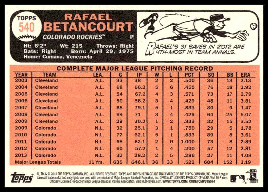 This BaseballΒ card, from 2015 is part of the Topps Heritage High NumberΒ card set. Rafael Betancourt is featured and has a card number of 540.