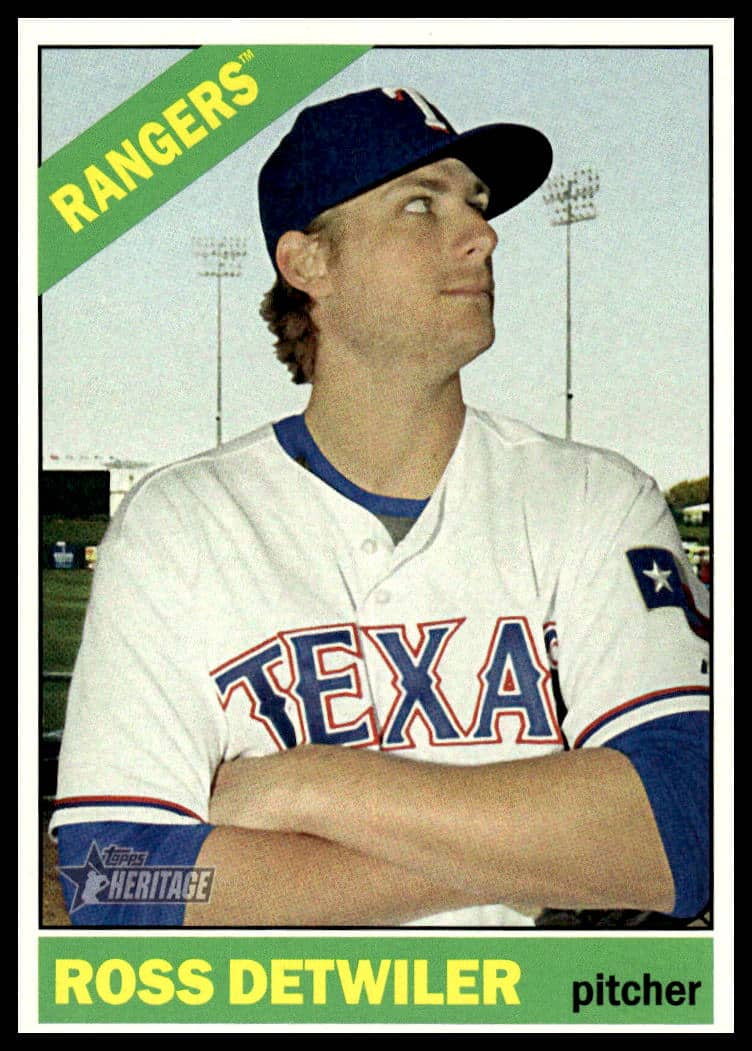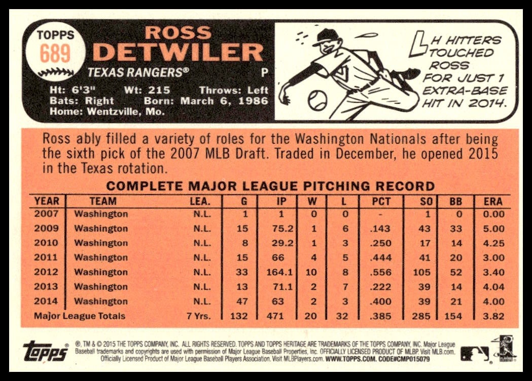 This BaseballΒ card, from 2015 is part of the Topps Heritage High NumberΒ card set. Ross Detwiler is featured and has a card number of 689.