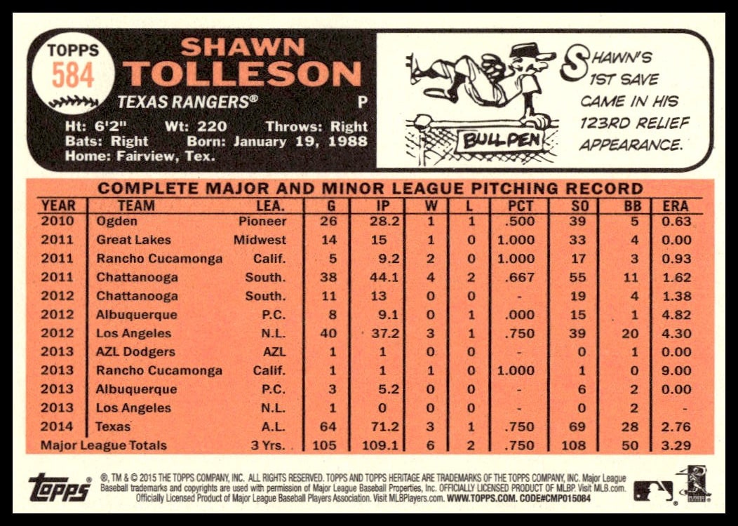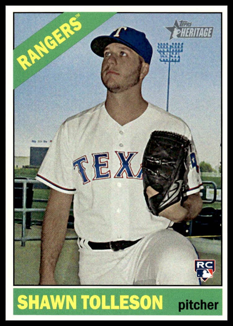 This BaseballΒ card, from 2015 is part of the Topps Heritage High NumberΒ card set. Shawn Tolleson is featured and has a card number of 584.