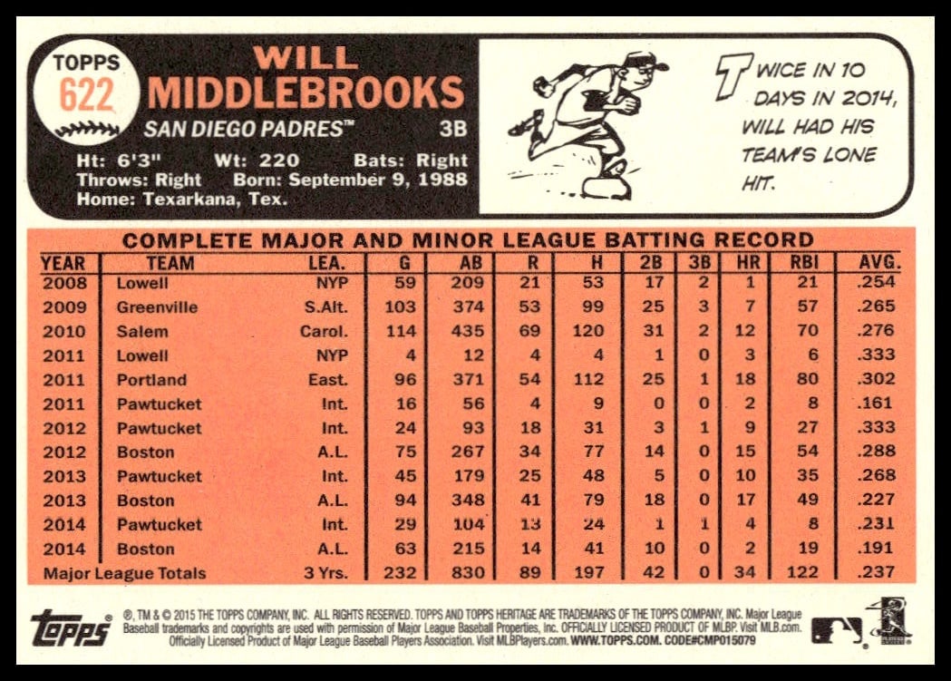 2015 Topps Heritage High Number Will Middlebrooks #622