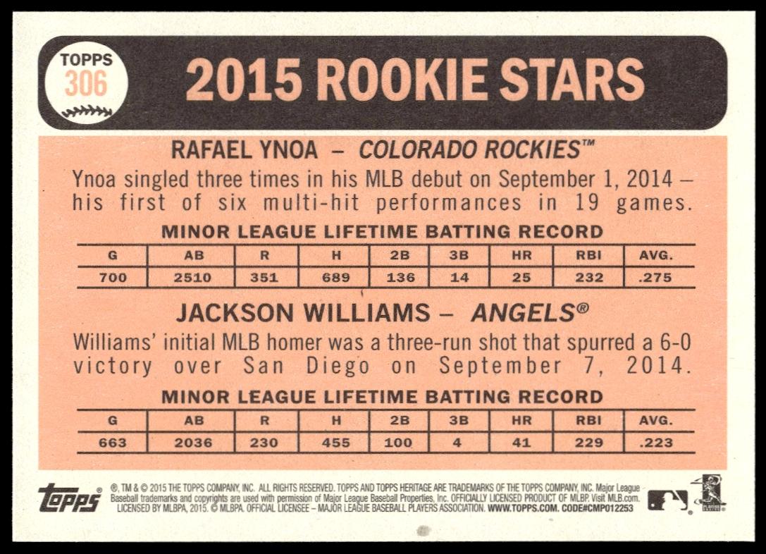 This Baseball card, from 2015 is part of the Topps Heritage card set. Jackson Williams / Rafael Ynoa is featured and has a card number of 306.