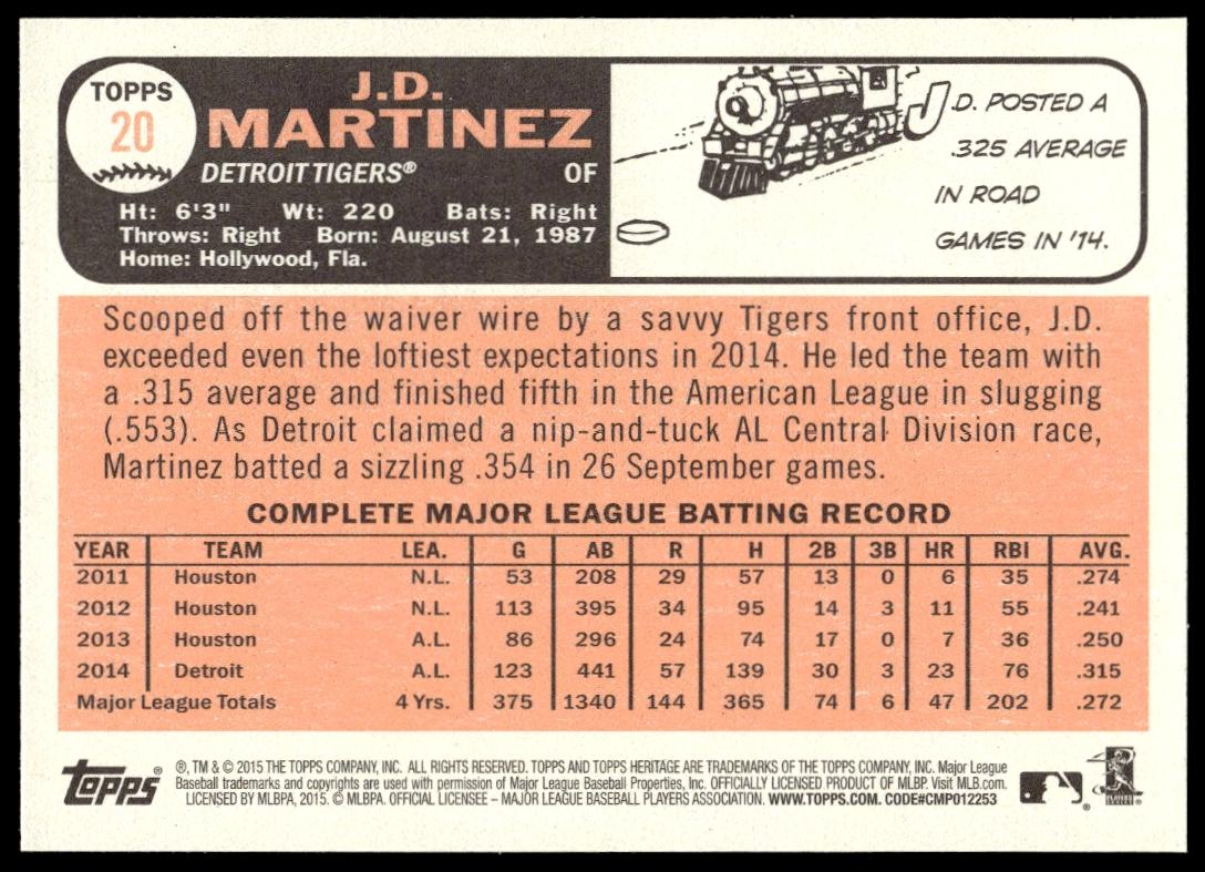 This BaseballΒ card, from 2015 is part of the Topps HeritageΒ card set. J.D. Martinez is featured and has a card number of 20.