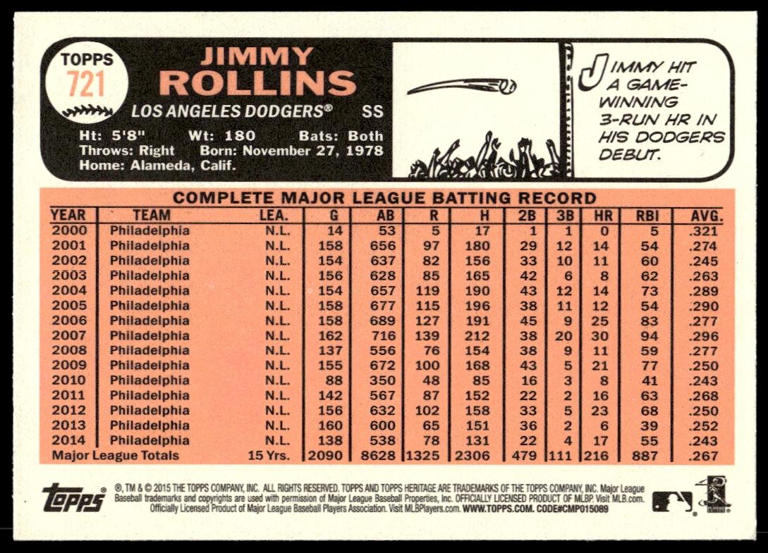 This BaseballΒ card, from 2015 is part of the Topps HeritageΒ card set. Jimmy Rollins is featured and has a card number of 721.