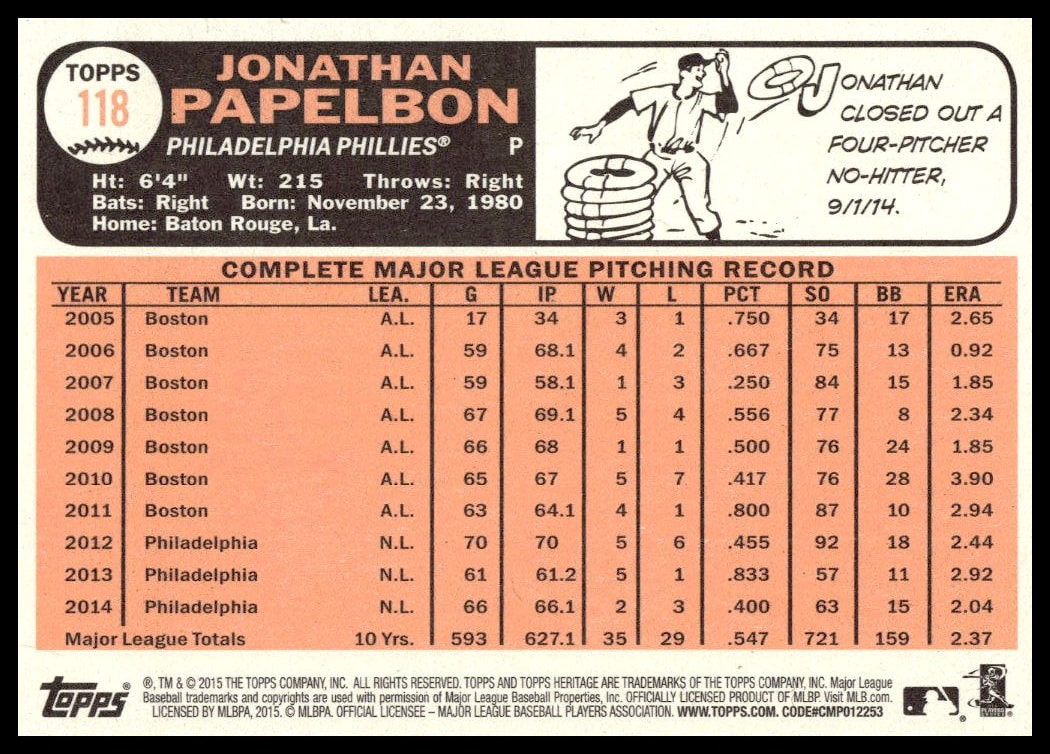This BaseballΒ card, from 2015 is part of the Topps HeritageΒ card set. Jonathan Papelbon is featured and has a card number of 118.