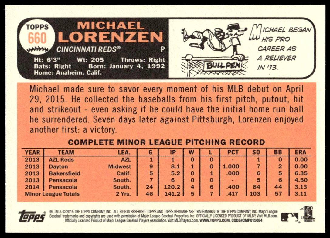 This BaseballΒ card, from 2015 is part of the Topps HeritageΒ card set. Michael Lorenzen is featured and has a card number of 660.