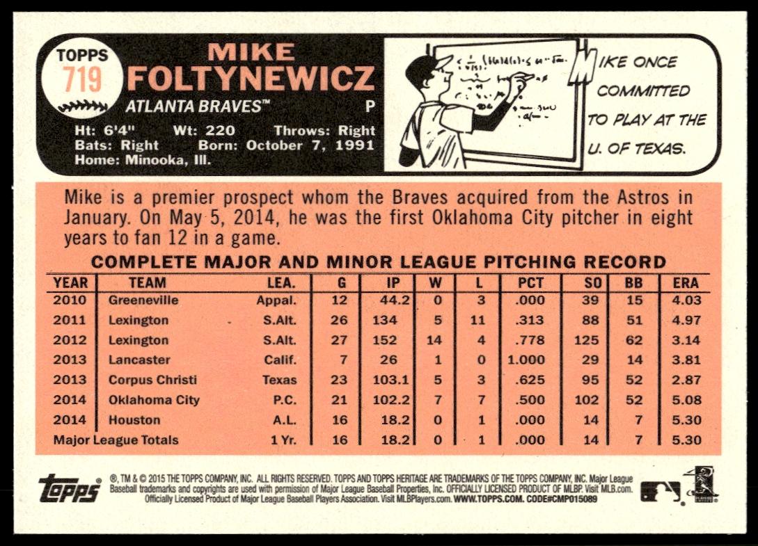 This BaseballΒ card, from 2015 is part of the Topps HeritageΒ card set. Mike Foltynewicz is featured and has a card number of 719.
