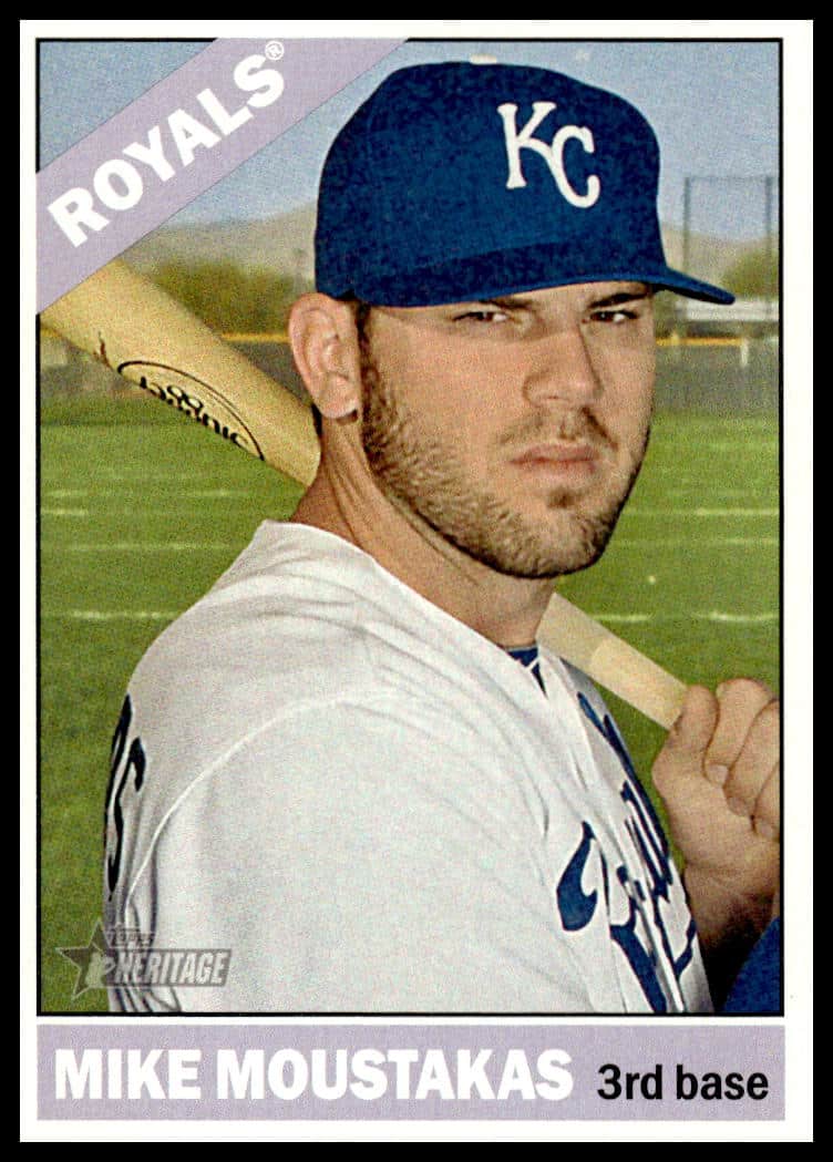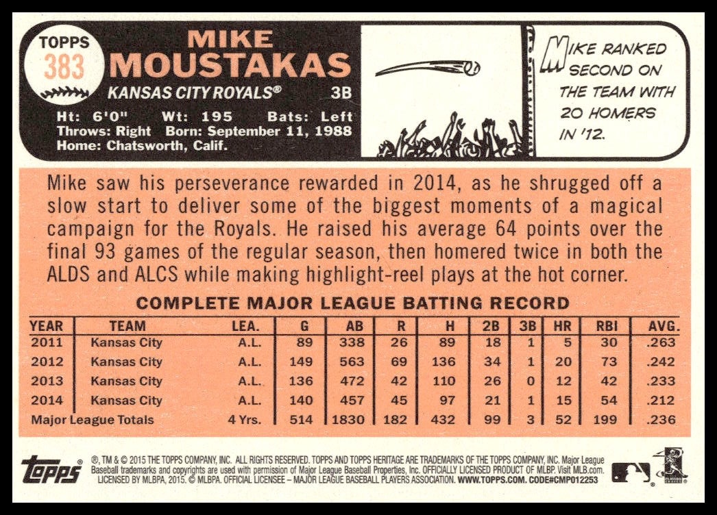 This Baseball card, from 2015 is part of the Topps Heritage card set. Mike Moustakas is featured and has a card number of 383.