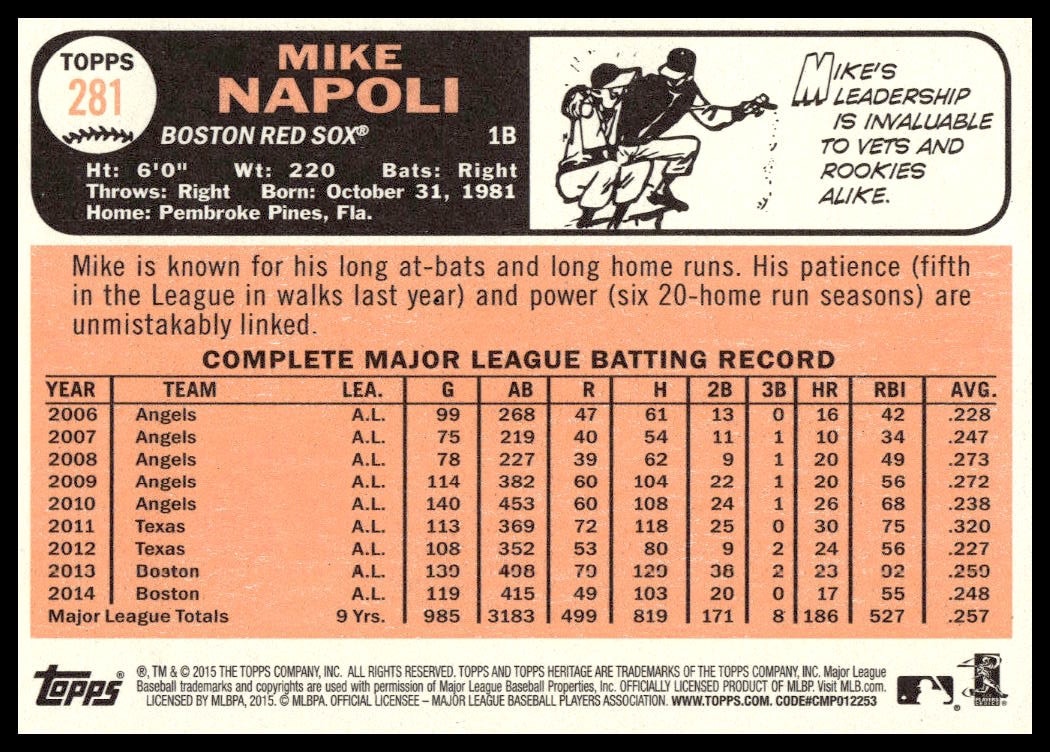 This BaseballΒ card, from 2015 is part of the Topps HeritageΒ card set. Mike Napoli is featured and has a card number of 281.
