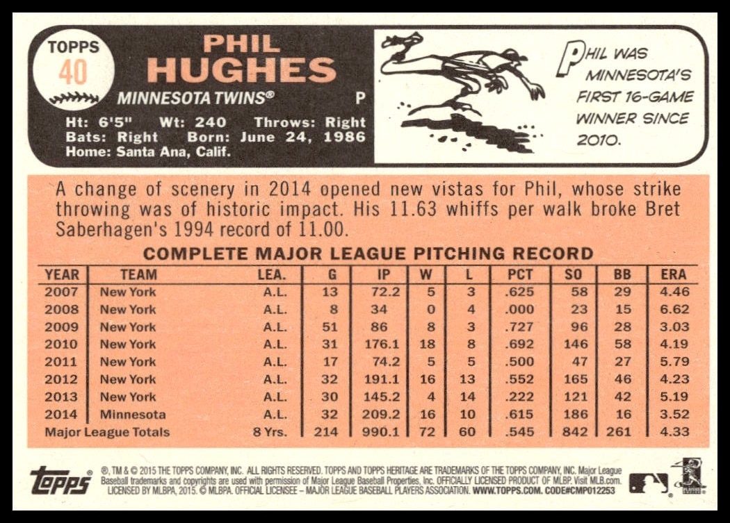 This BaseballΒ card, from 2015 is part of the Topps HeritageΒ card set. Phil Hughes is featured and has a card number of 40.