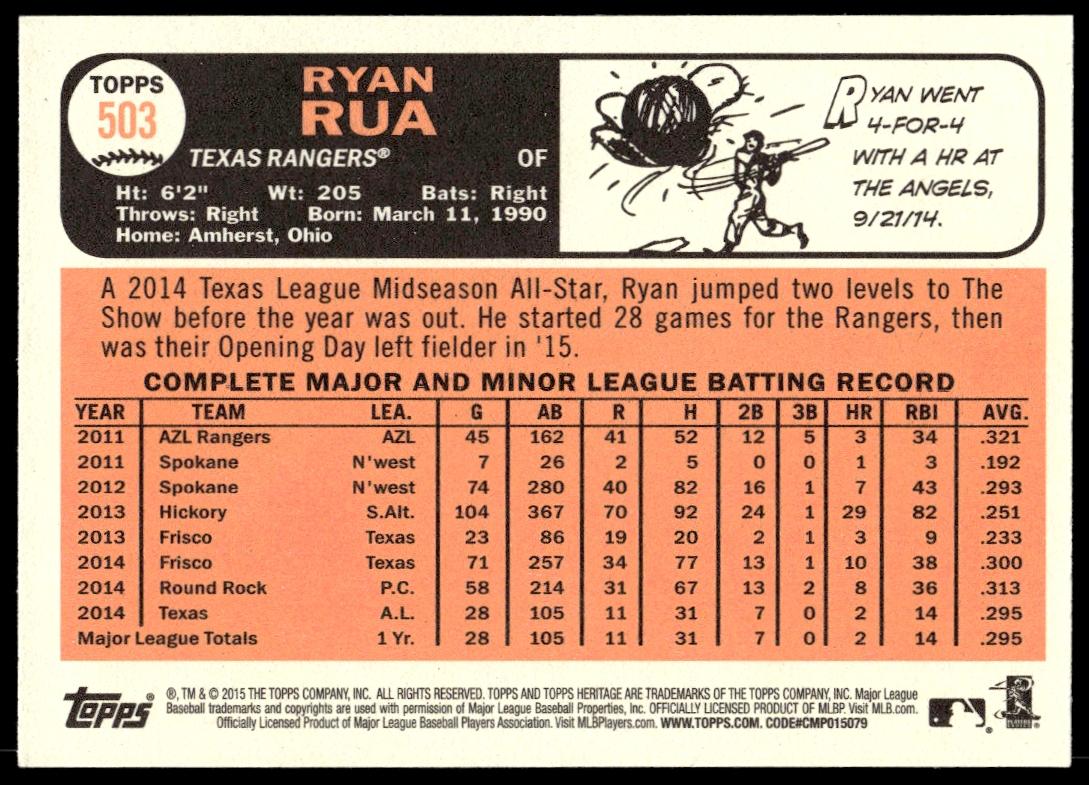This Baseball card, from 2015 is part of the Topps Heritage card set. Ryan Rua is featured and has a card number of 503.
