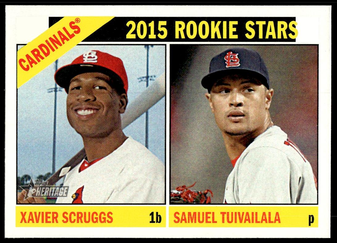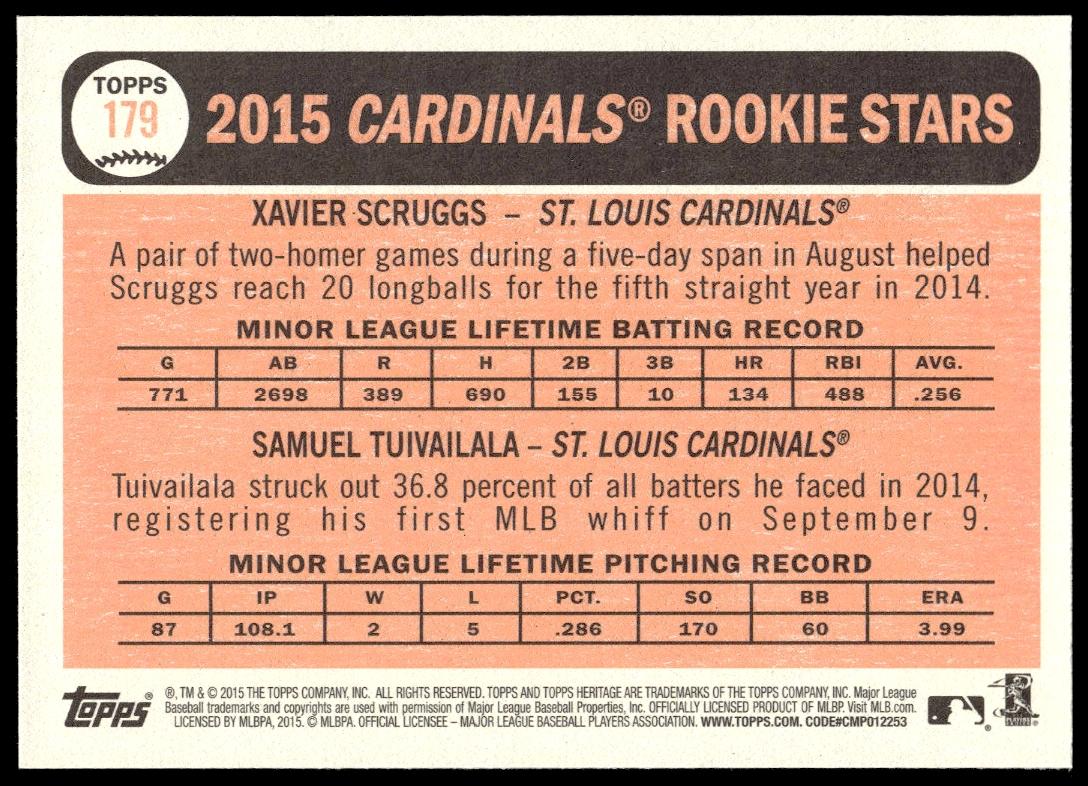 This Baseball card, from 2015 is part of the Topps Heritage card set. Samuel Tuivailala / Xavier Scruggs is featured and has a card number of 179.