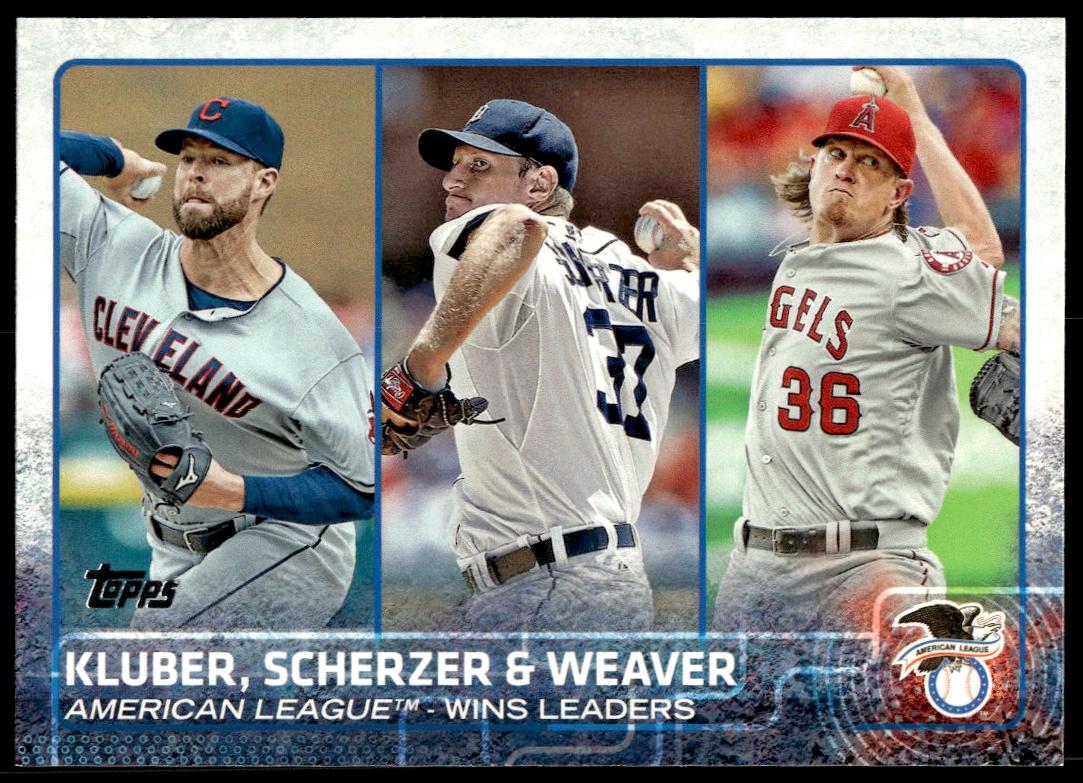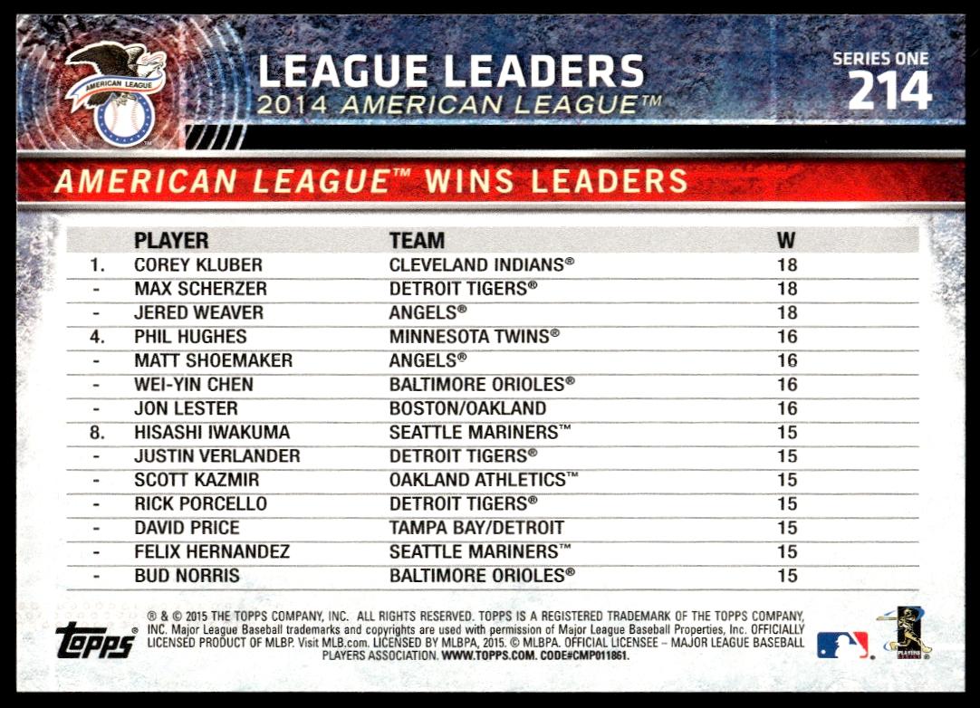 This Baseball card, from 2015 is part of the Topps Series 1 card set. American League Wins Leaders is featured and has a card number of 214.