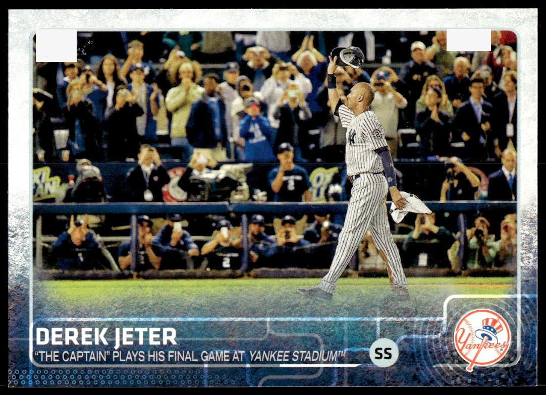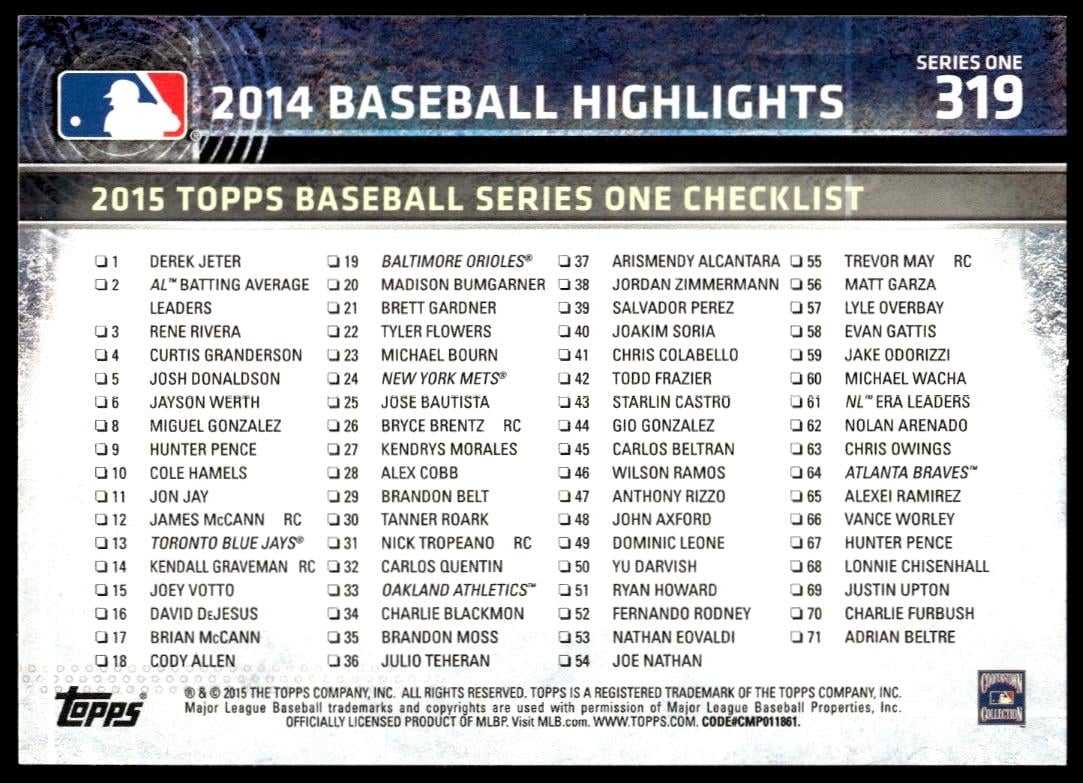 This Baseball card, from 2015 is part of the Topps Series 1 card set. Derek Jeter is featured and has a card number of 319.